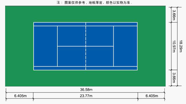 一片标准的网球场地,占地面积应不小于670㎡(长36.60米、宽18.30米),其中双打场地标准尺寸为长23.77米、宽10.97米。如果是两片或两片以上相邻而建的并行网球场地,两片场地之间距离应不小于5米。
